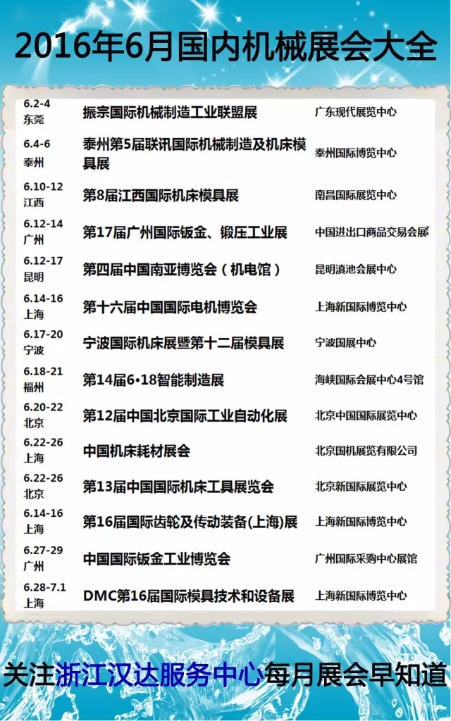 廣大工業(yè)機(jī)械從業(yè)者們,我們整理了2016年6月份展會一覽,展會時間、名稱、地點均有一一核對檢查,確保無誤,請各位放心參考。